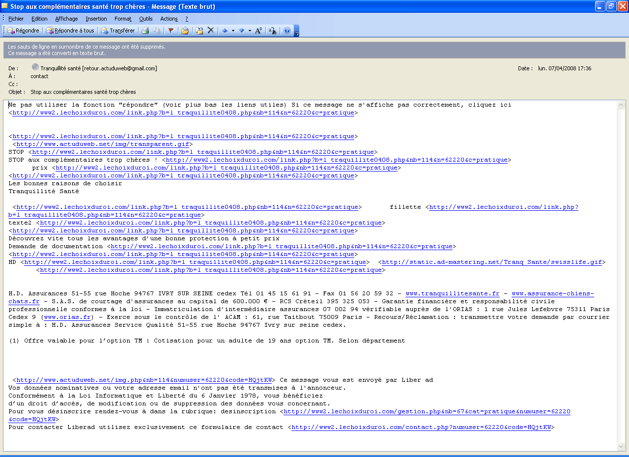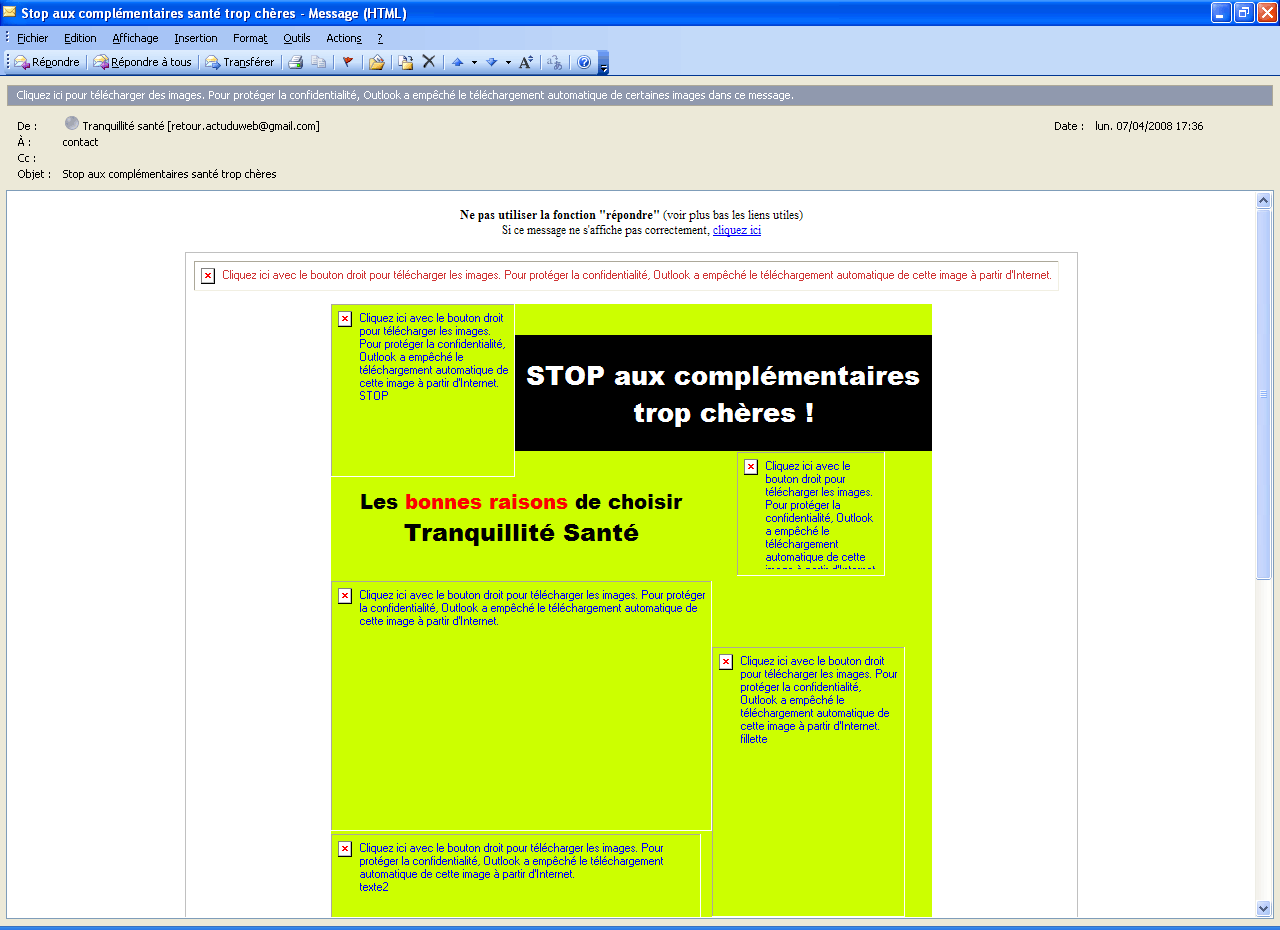 Voici donc un email arrivé en indésirable dans ma messagerie, et voici comment il apparaît. Pas sexy du tout, il ne sera pas relu, et perd alors toute chance d’être récupéré.